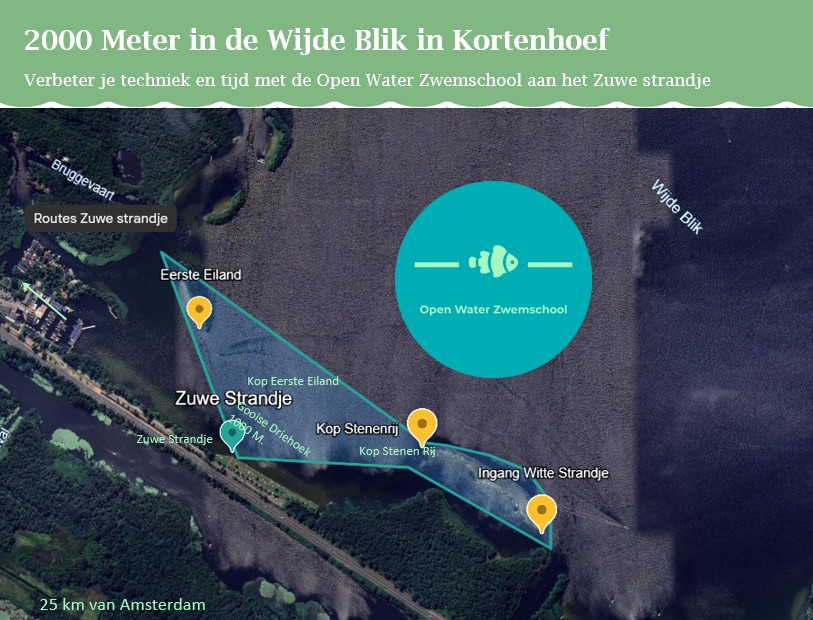 De Wijde Blik is een van de prachtige Loosdrechtse plassen met superhelder zwemwater. Vanaf het Zuwe strandje aan de N201 hebben we verschillende routes uitgezet, bijvoorbeeld deze Gooise Driehoek van 1000 meter. Bij slechter weer zwemmen of bij drukte zwemmen we in de Spiegelplas (Nederhorst den Berg).